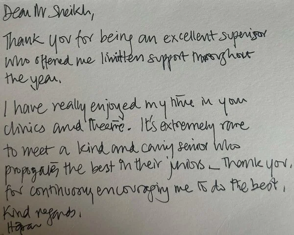 Mr. Sheikh has dedicated a significant part of his career to the education and mentorship of upcoming ophthalmologists, both within the UK and internationally. His involvement in training programmes and workshops has contributed to the development of high standards in ophthalmic care worldwide.